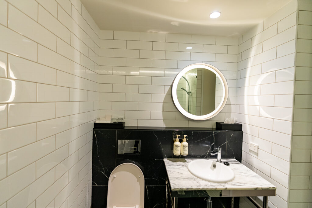 The bathroom keeps the monochrome brief: glossy white subway tiles, a black-stone backsplash and a round back-lit mirror over a marble vanity with an inset basin. Fixtures are unfussy and functional, the walk-in shower generous, and full-size Ink & Water amenities neatly wall-mounted. The flattering light from the recessed ceiling and the mirror’s halo makes those pre-dawn departures a touch gentler, and thick, warm towels deliver the right kind of finish. It reads like a small city home that understands business travel; close the door, reset, and get things done without the room ever getting in the way.