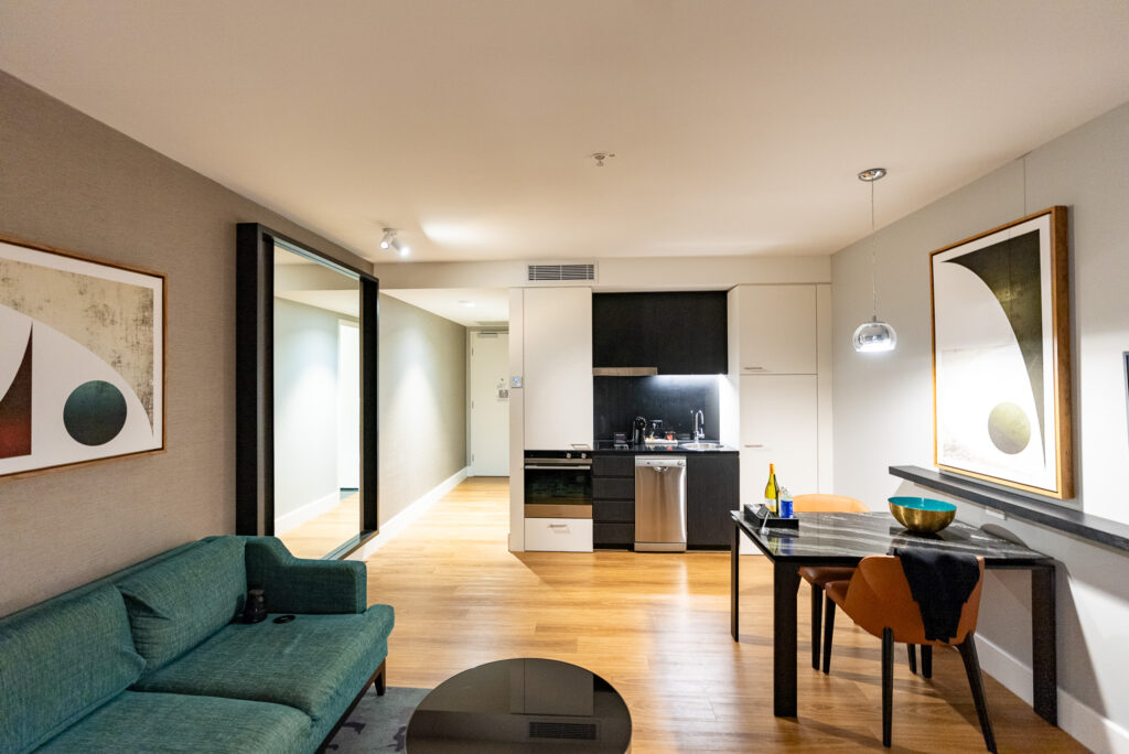 Warm timber floors, an open-plan space with a low green sofa provide for a quiet stretch after a long flight. A proper two-seat dining/work table under a chrome pendant doubles as the right size work space to touch up those last minute briefs. The galley kitchen is sensibly kitted with matching black cabinetry, full-size fridge, cooktop, microwave and dishwasher with clean task lighting so breakfast and late returns run on your schedule.