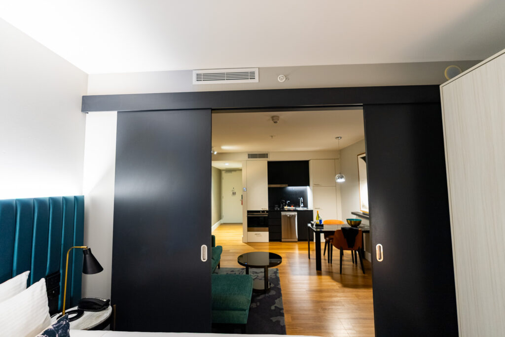 A sliding black pocket door divides the bedroom from a living zone that settles into a calm, workable rhythm.