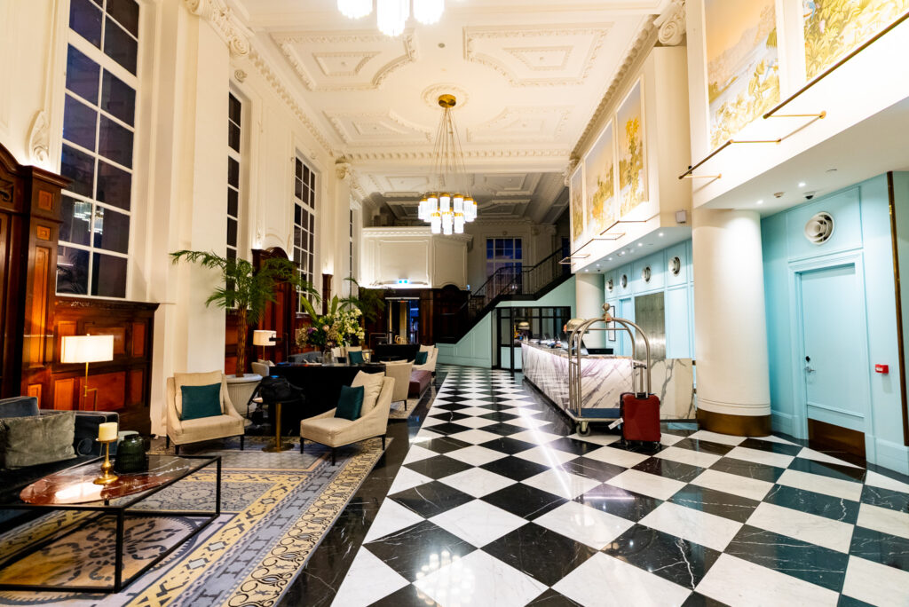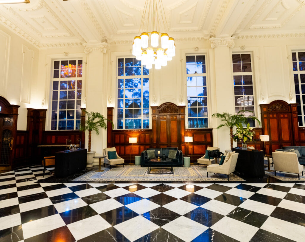 The lobby unfolds as a grand banking chamber, leadlight doors opening to soaring windows, a canopy of ornate plasterwork, polished timber and sandstone accents, and a statement staircase sweeping upward beneath chandeliers that cast a warm, golden wash.