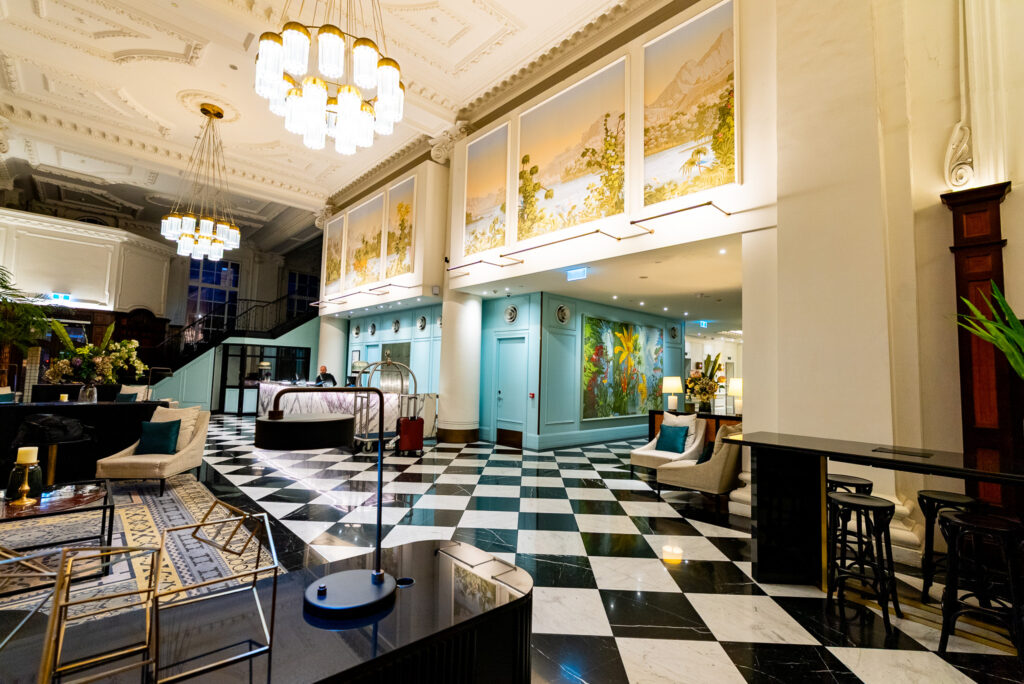 The lobby unfolds as a grand banking chamber, leadlight doors opening to soaring windows, a canopy of ornate plasterwork, polished timber and sandstone accents, and a statement staircase sweeping upward beneath chandeliers that cast a warm, golden wash.