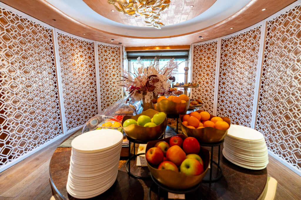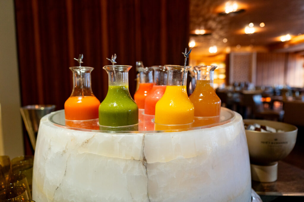 Breakfast includes plenty of health-conscious options, including an array of freshly squeezed juices (think orange, apple, carrot-ginger and seasonal blends) and herbal mineral shots. Those who prefer a more celebratory start can opt for a glass of Champagne, poured with discretion and just the right chill.